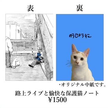 のうじょうりえ活動10周年記念グッズ、のうじょうりえの原点、路上ライブと愉快な保護猫ノートです。